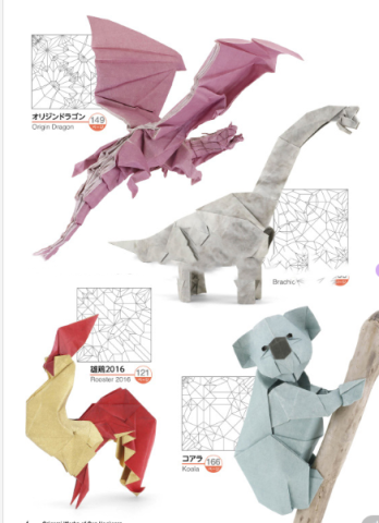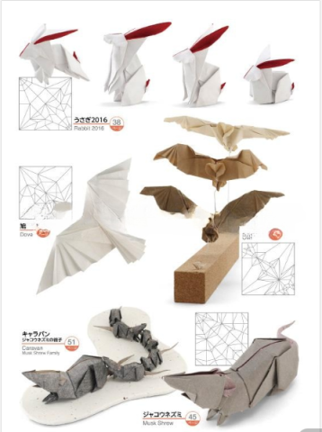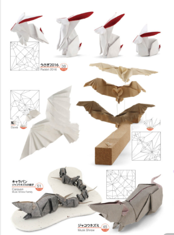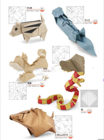收录20幅作品,收录作品主要有= 15°蜗牛、老鼠2017年、蝙蝠、松鼠2015年、小狐狸、猕猴桃、兔子2016年、麝香鼠、鸽子、猫头鹰、小鸟、野猪2019年、乌里诺、豆丛、海獭、蛇、公鸡2016年、腕龙, 起源龙 , 考拉2,折叠方法也全部展示出来。